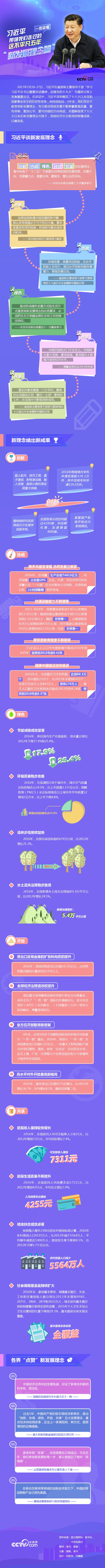 7月26至27日,习近平在省部级主要领导干部“学习习近平总书记重要讲话精神,迎接党的十九大”专题研讨班上发表重要讲话。在讲话中,习近平深刻概括了十八大以来党和国家事业发生的历史性变革,他特别指出:5年来,我们坚定不移贯彻新发展理念,有力推动我国发展不断朝着更高质量、更有效率、更加公平、更可持续的方向前进。本图解梳理了十八大以来习近平总书记关于新发展理念的部分论述,以及在新发展理念引领下我国经济社会取得的辉煌成就,以飨读者。